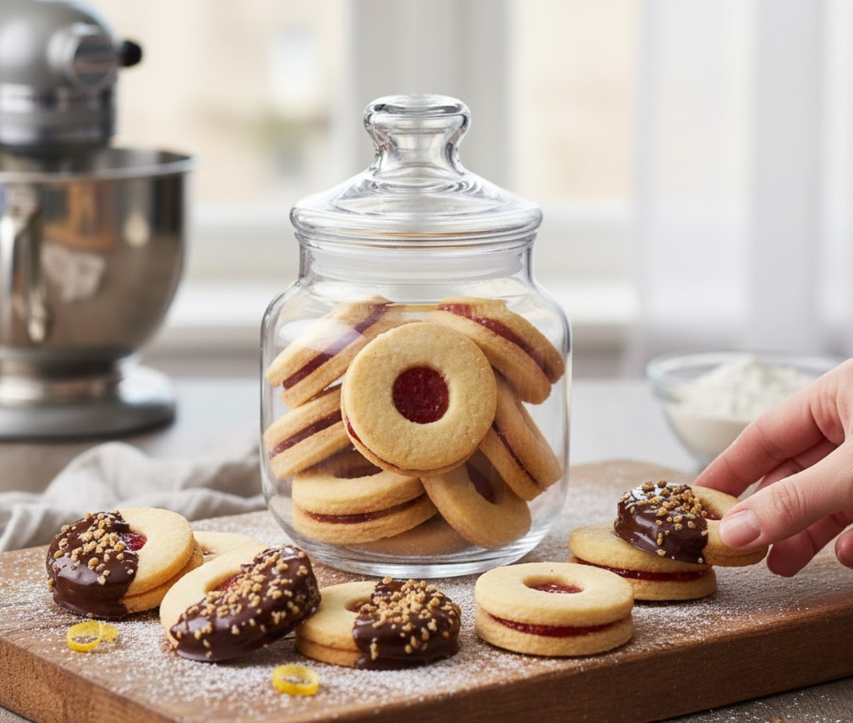 - עוגיות ריבה: קורצים עיגולים (חצי עם חור), אופים, ומצמידים עם ריבה לאחר קירור.