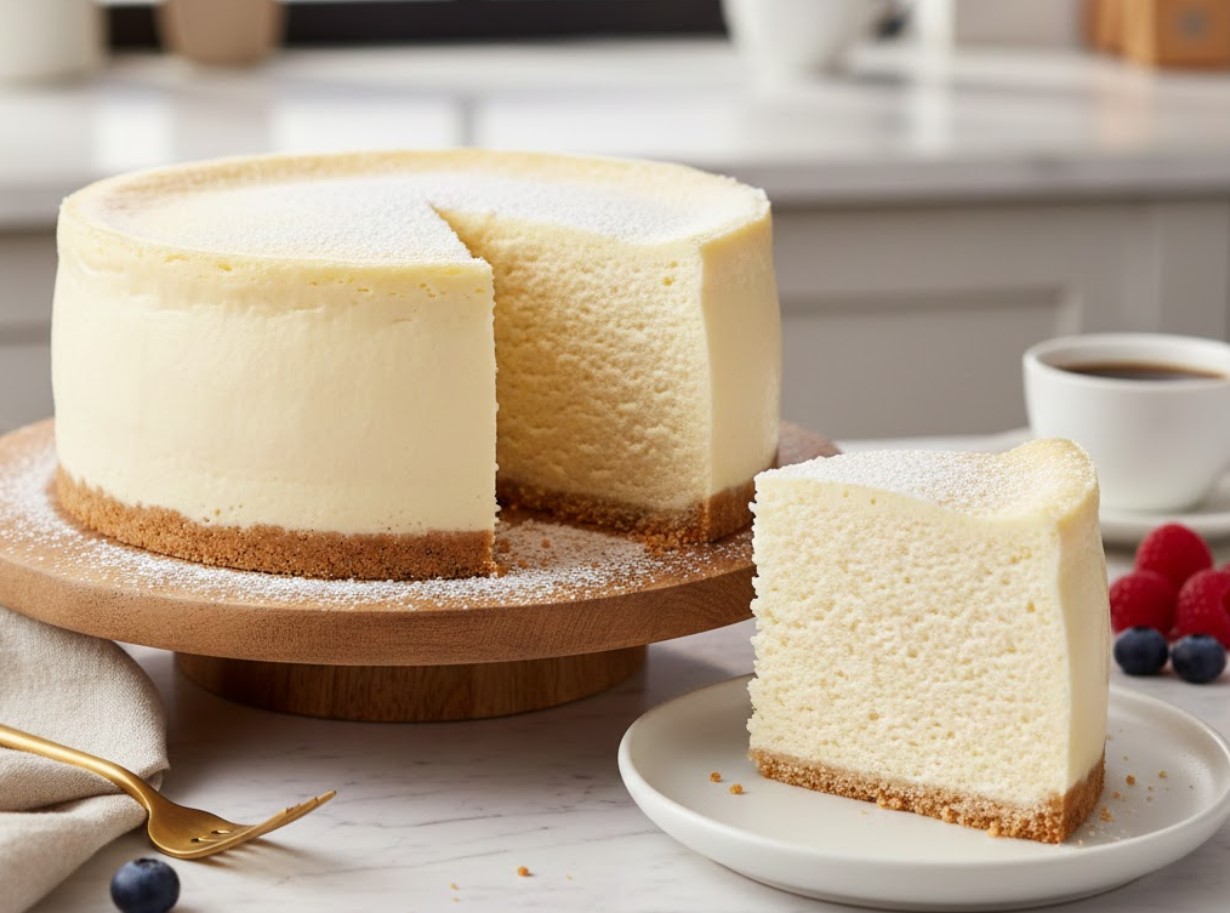 זו העוגה שתמיד גונבת את ההצגה. היא גבוהה, לבנה, חגיגית ובעלת מרקם של ענן. הטריק כאן הוא אפייה איטית באמבט מים, ששומרת עליה עסיסית ומונעת סדקים.