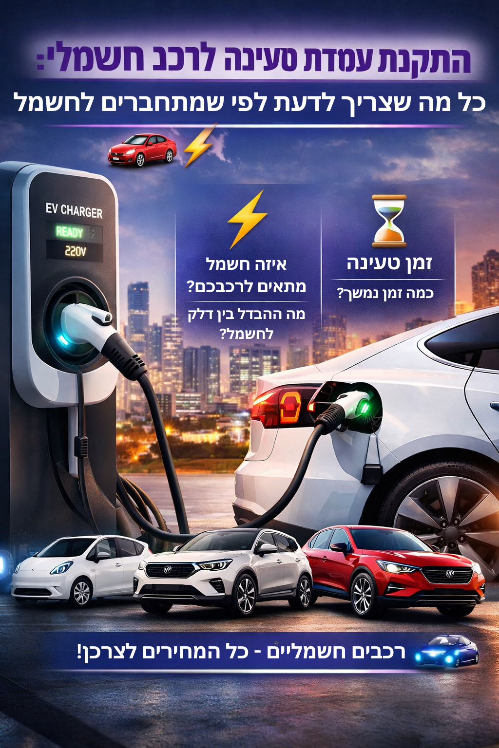 - עמדת טעינה ביתית: 2,500–5,000 ₪ (תלוי ביצרן ובפונקציות).